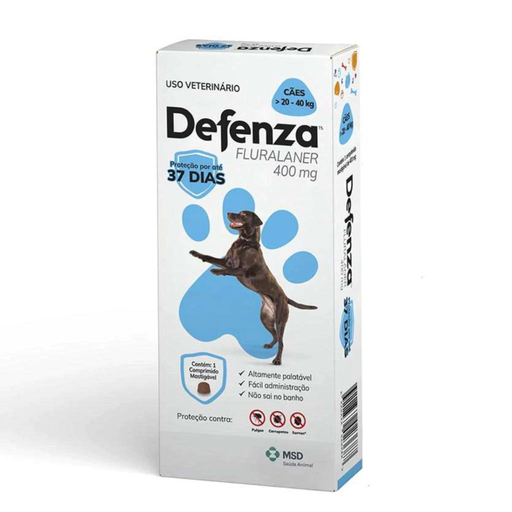 O Antipulgas Defenza MSD é um medicamento contra pulgas, carrapatos e sarnas que dura até 37 dias, o maior tempo de ação entre as soluções mensais. Além disso, também protege contra Tunga penetrans, o bicho-de-pé, uma zoonose que pode acometer animais e humanos. Muito fácil de administrar, é um comprimido mastigável, em formato de petisco, com sabor de fígado suíno, muito bem aceito pela maioria dos cães. Possui ação sistêmica, que garante eficácia uniforme por todo o corpo do cão, não havendo interferência de banhos.
