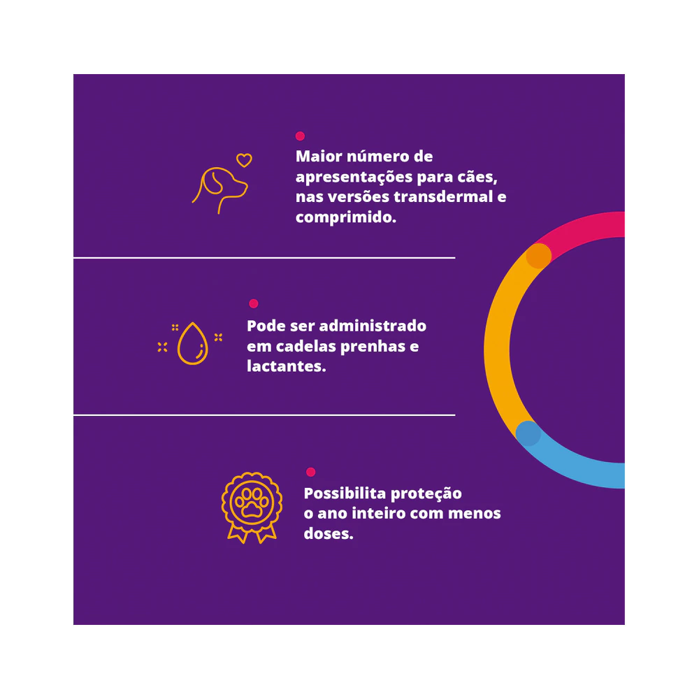 Indicação: Controle e prevenção de pulgas e carrapatos em cães com mais de 8 semanas de idade e peso superior a 2 kg.