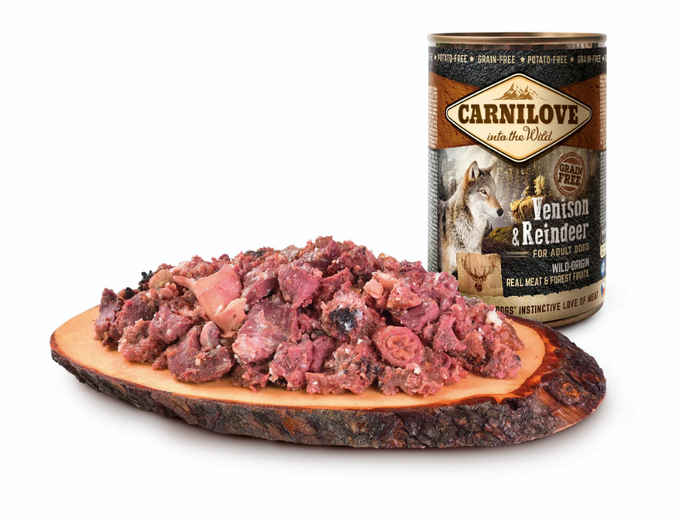 Alimento úmido completo para cães adultos. Carne de Cervo e Rena livre de grãos. Produto proibido para alimentação de ruminantes.