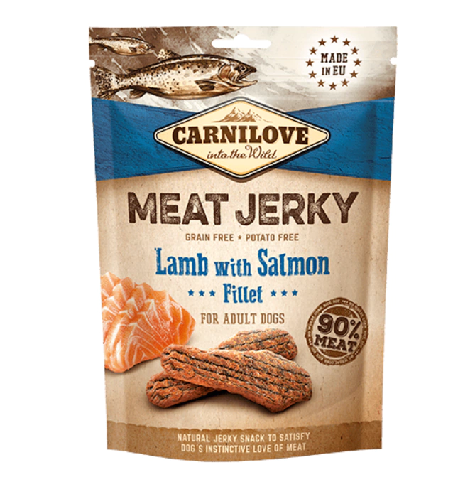 Meat Jerky Filés de cordeiro com salmão adequado para todos os cães.