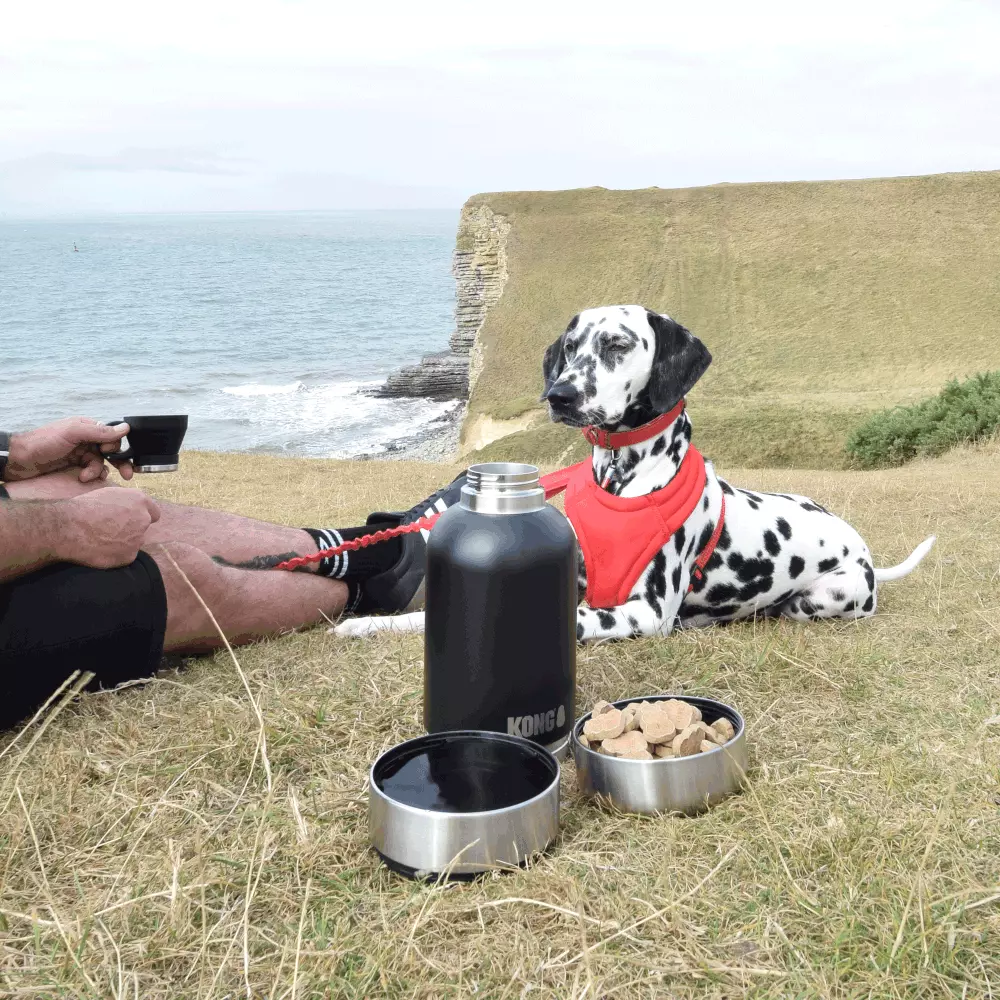 A Kong Duo Day Trek XL 1820 mL é uma garrafa premium desenvolvida para acompanhar um dia inteiro de aventuras com o seu cão. Feita em aço inoxidável de grau culinário, com parede dupla e isolamento a vácuo, ela mantém a temperatura da água por longos períodos, garantindo hidratação fresca e prática durante passeios, trilhas, viagens ou atividades externas. Diferente de garrafas comuns, ela também inclui dois bowls integrados e um copo para o tutor, oferecendo um sistema completo em um único produto.