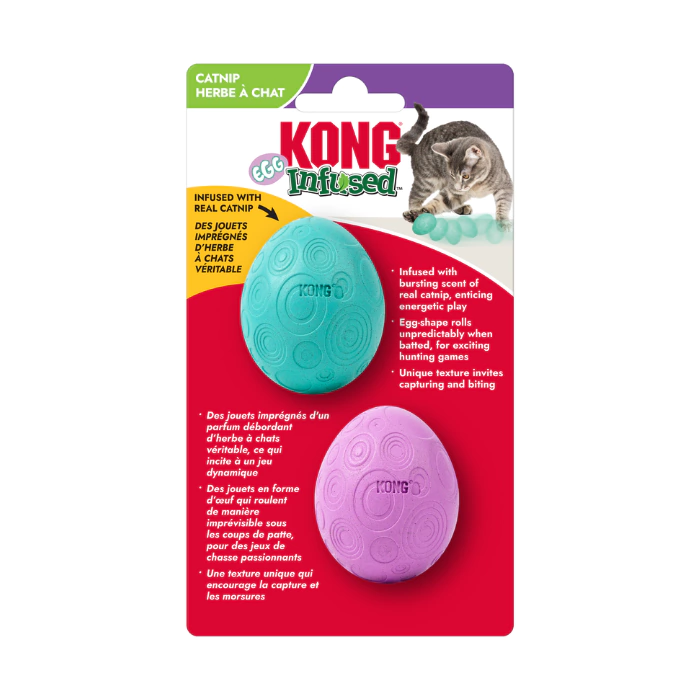 Kong Infused Catnip Egg são perfeitos para uma caça aos ovos durante todo o ano! Estes brinquedos em forma de ovos balançam e rolam erraticamente quando atingidos, dando-lhes um toque imprevisível na hora de brincar.