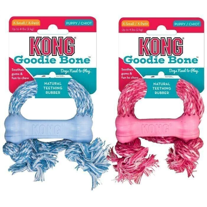 Este KONG Goodie Bone com Corda é personalizado para os dentes de leite dos filhotes em crescimento, apresentando uma fórmula exclusiva de borracha natural que é a mais suave da linha de brinquedos de borracha KONG.