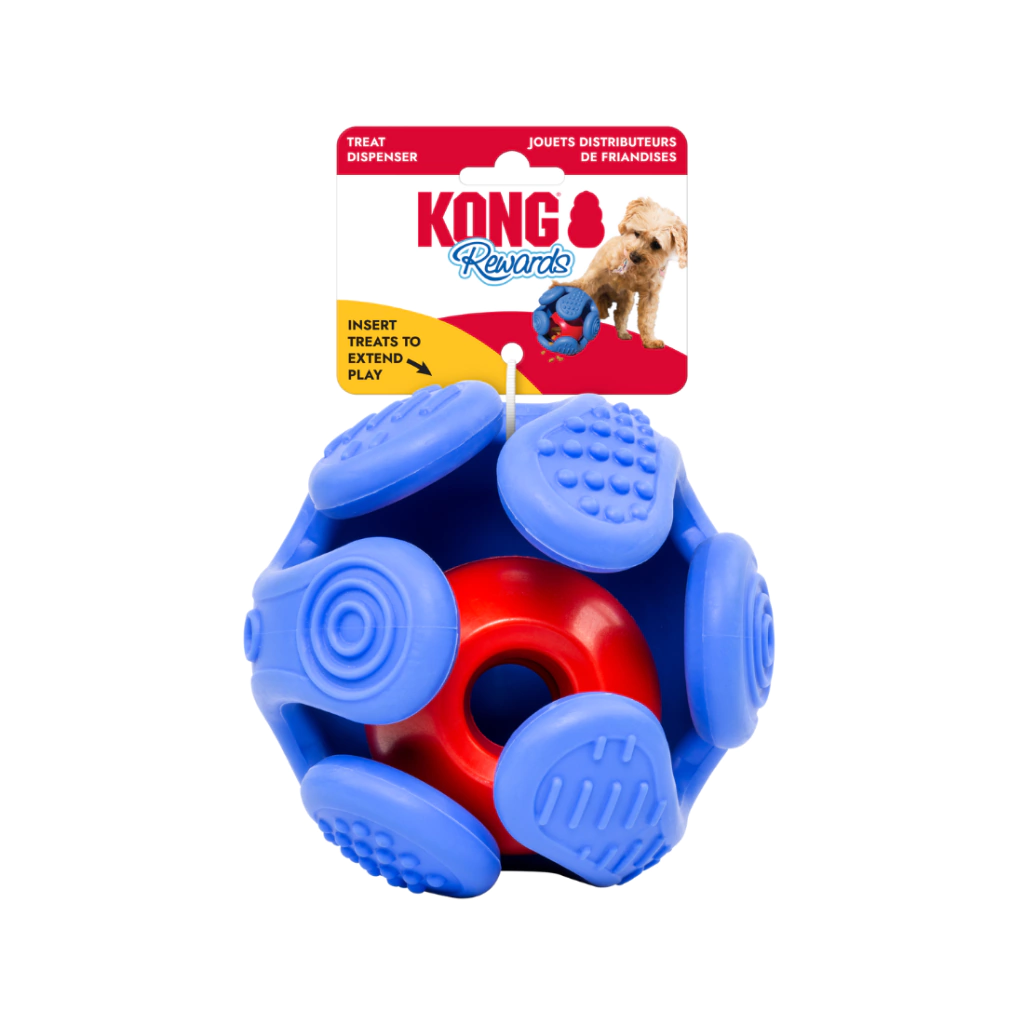O Kong Rewards Wrapz é um alimentador interativo que dispensa alimento de dentro de uma bolinha que fica colocada dentro de um brinquedo de borracha com garras que dificultam a saída da bolinha.