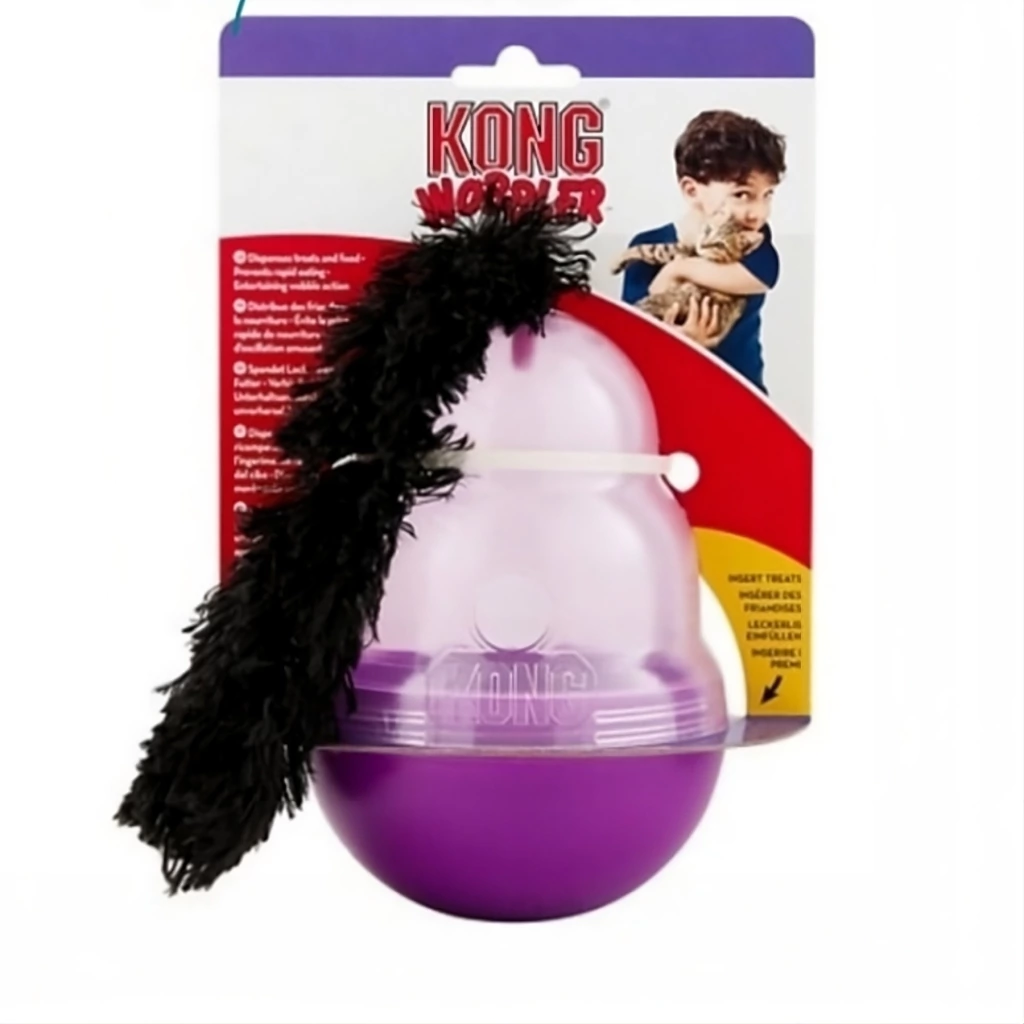 O KONG Cat Wobbler™ é um brinquedo interativo que estimula mental e fisicamente os gatos, tornando a hora da refeição mais divertida e desafiadora. Com um design que balança e libera petiscos, incentiva os felinos a trabalharem pela comida, despertando seus instintos naturais de caça. Quando utilizado como comedouro, ajuda a reduzir a velocidade da alimentação, combatendo o tédio e auxiliando no controle do peso.