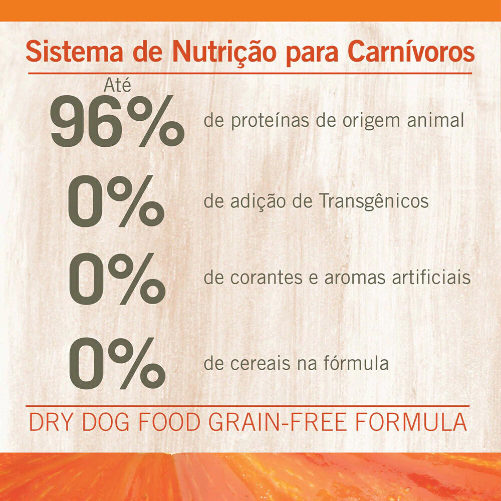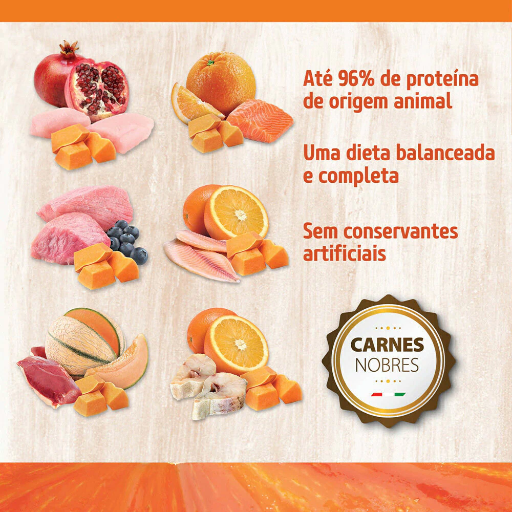 carne de frango (mecanicamente separada), farinha de vísceras de aves (mín. 10%), ovo desidratado, aveia (mín. 1%), sorgo, cevada (mín. 1%), farinha de peixe, óleo de frango, óleo de peixe, polpa de beterraba, casca de ervilha, alfafa desidratada, lignocelulose, semente de psyllium, levedura seca de cervejaria, cenoura desidratada, espinafre desidratado, laranja desidratada, maçã desidratada, blueberry desidratado, extrato de romã (mín. 0,075%), extrato de chá verde, extrato de aloe vera, cúrcuma em pó, beta caroteno, luteína, aditivos prebióticos (FOS e MOS), DL-metionina, taurina, L-carnitina, sulfato de condroitina, sulfato de glicosamina, extrato de yucca, zeolita, hidrolisado de fígado de frango e suíno, vitaminas (A, D3, E, B1, B2, B6, B12, C, biotina, niacina, ácido pantotênico, ácido fólico, cloreto de colina), fosfato bicálcico, cloreto de potássio, ferro aminoácido quelato, cobre aminoácido quelato, zinco aminoácido quelato, manganês aminoácido quelato, proteinato de selênio, iodato de cálcio, propionato de cálcio, concentrado de tocoferóis.