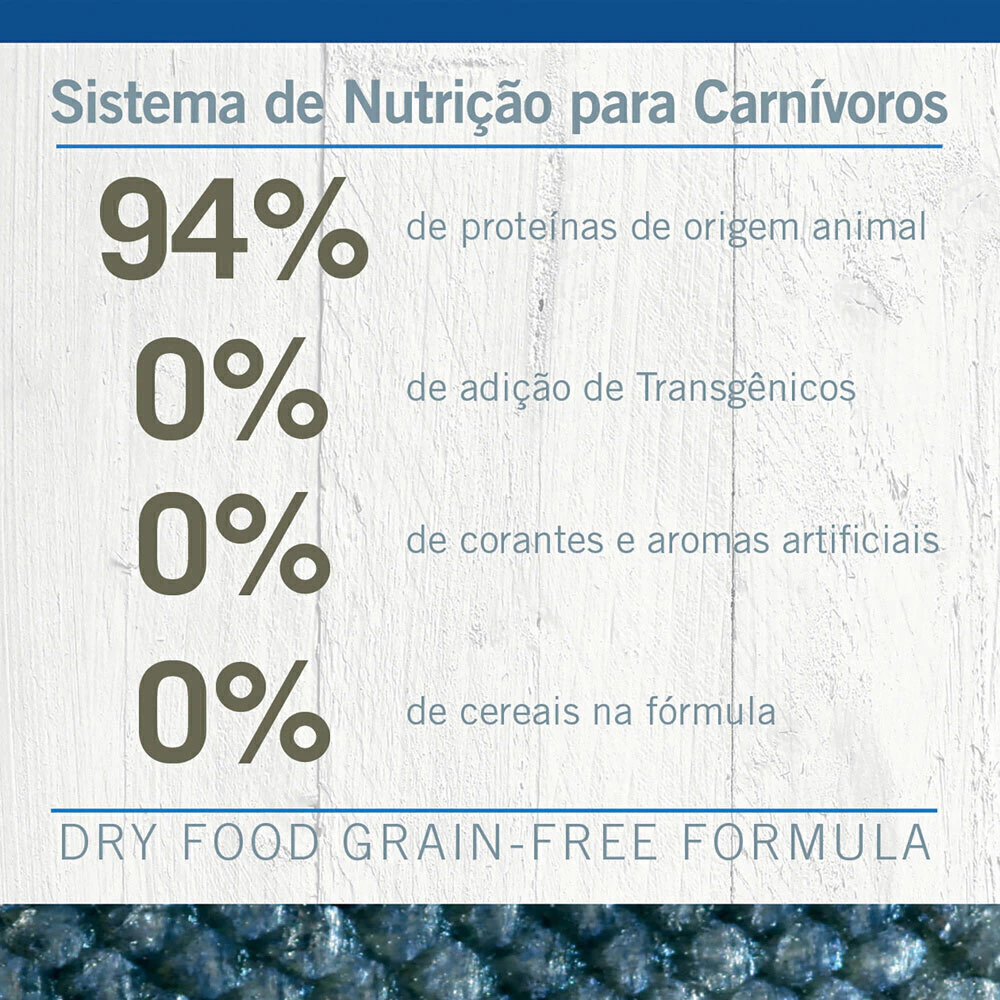 Salmão (carne mecanicamente separada de salmão, farinha de salmão – mín. 8%), farinha de peixe, farinha de vísceras de aves, farinha de torresmo, ovo em pó, amido de batata, amido de mandioca, óleo de peixe, óleo de frango, polpa de beterraba, casca de ervilha, alfafa desidratada, celulose em pó, lignocelulose, semente de psyllium, levedura seca de cervejaria, melão desidratado (mín. 0,1%), cenoura desidratada, espinafre desidratado, laranja desidratada, maçã desidratada, extrato de mirtilo (blueberry), romã desidratada, extrato de chá verde, extrato de aloe vera, cúrcuma em pó, beta caroteno, aditivos prebióticos (FOS e MOS), DL-metionina, taurina, L-carnitina, sulfato de condroitina, sulfato de glicosamina, aditivos adsorventes (extrato de yucca e zeolita), hidrolisado de peixe, vitaminas (retinol (A), colecalciferol (D3), acetato de DL-alfa-tocoferol (E), tiamina (B1), riboflavina (B2), cloridrato de piridoxina (B6), cianocobalamina (B12), ácido ascórbico monofosfato (C), biotina, niacina, ácido pantotênico, ácido fólico, cloreto de colina), cloreto de potássio, ferro aminoácido quelato, cobre aminoácido quelato, zinco aminoácido quelato, manganês aminoácido quelato, proteinato de selênio, iodato de cálcio, propionato de cálcio, concentrado de tocoferóis.